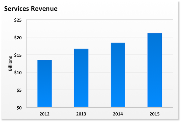 You might not realize it, but Apple's services business is growing like a weed right now. Services revenue last year was $21.2 billion, up 15% from 2014. Annual services revenue was just $13.5 billion as recently as 2012.