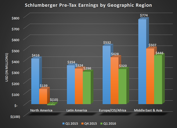 Another thing to consider is that Halliburton and Baker Hughes have a much larger exposure to North America than Schlumberger, so don't be surprised if results from these two are even weaker because of the brutal market in the U.S.