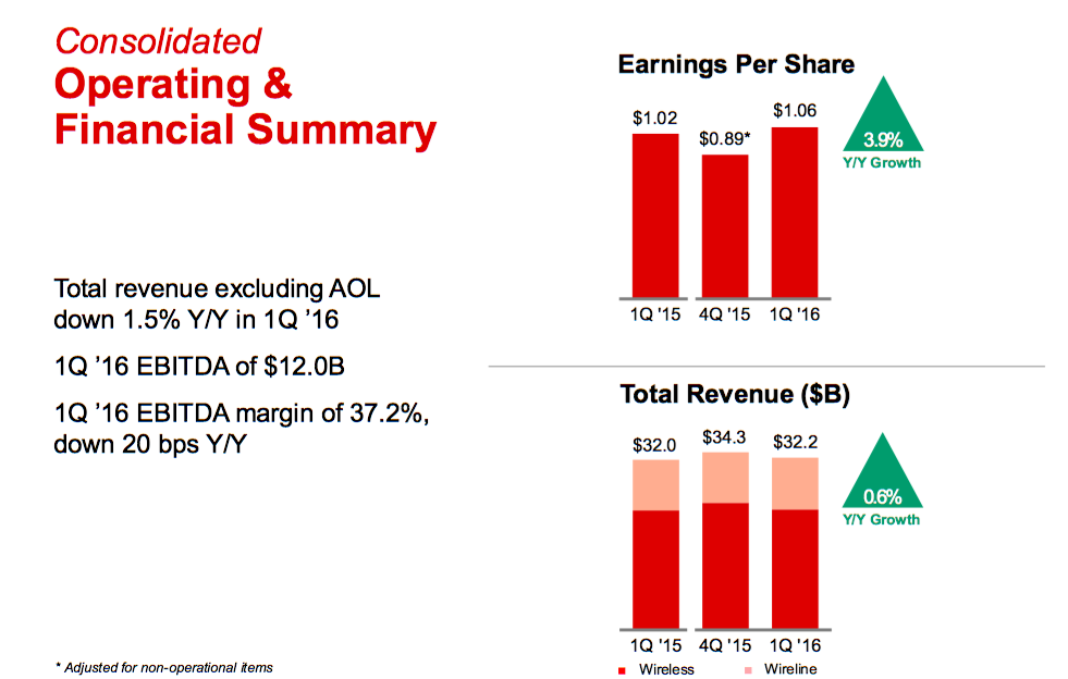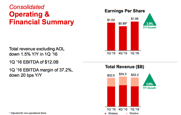 Verizon (NYSE: VZ) added customers and increased its earnings per share (EPS) from $1.02 in last year's first quarter to $1.06 in the same period for 2016 -- a 3.9% gain. "Verizon's strong first-quarter results demonstrate our capacity to compete effectively, while executing on our plan of continued network leadership and seeding new growth markets in mobile video and the Internet of Things," said Chairman and CEO Lowell McAdam in the earnings release.