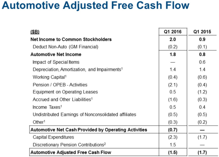 Within about 10 seconds of glancing at GM's press release, the first thought than ran through my mind was: "What is happening to GM's cash flow?" The answer became partially apparent 23 slides into GM's first-quarter presentation slide deck; see for yourself.