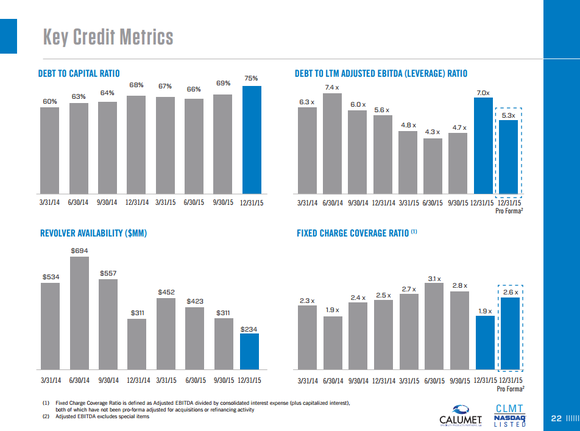 On the other hand, Calumet put itself in a bind, both financially and through its payout policy that made it extremely difficult to meet its financial obligations. Between 2011 and 2014, the company made $1.27 billion in acquisitions that led to a blowout on the balance sheet. As of the most recent quarter, the company's net debt to EBITDA ratio was 5.8, which is quite high for both a refiner and a master limited partnership. What makes this figure even more troubling is that 2015 was one of the best times in recent history to be in the refining business. Cheap crude oil meant cheap feedstock supplies. Yet even with a favorable operating environment, Calumet's balance sheet looked notably bloated.