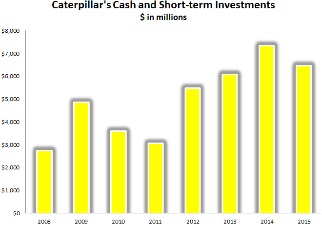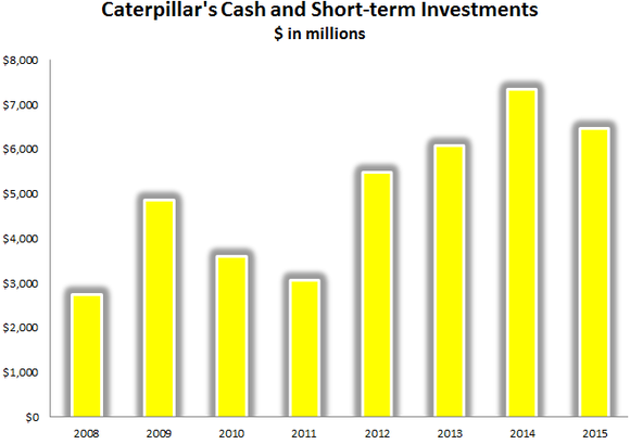 In the end, Caterpillar's consumers are mainly businesses of all sizes, almost guaranteed to come back over the long term instead of aging out of a sales cycle like Harley-Davidson's baby boomer demographic. And it offers a better dividend yield to boot. Lastly, for those concerned that Caterpillar's dividend is in jeopardy, it isn't. Despite a rough few years, the company's cash and short-term investments have remained very strong.