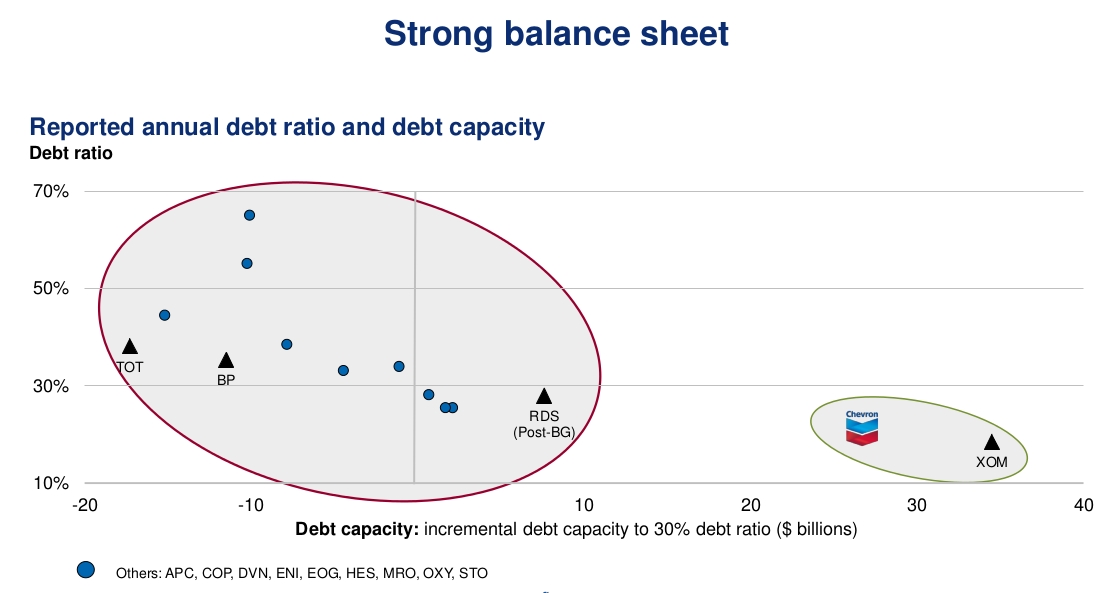 Second, Chevron's balance sheet is very strong. Its debt-to-capitalization ratio is among the industry's best, at 20%. Chevron could borrow almost $30 billion before the company hits the 30% debt ratio, and even then, Chevron's debt ratio would be better than many of its peers.