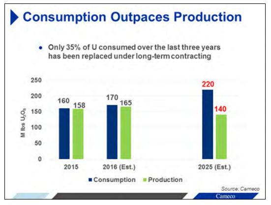 That brings us to the next chart, which illustrates an important consumption and supply dynamic. The blue line is consumption, and the green line is production. Notice that consumption outstripped uranium production in 2015 and is expected to do the same this year, too. The differences today are kind of small. However, look out to 2025. If nothing in the industry changes, there's going to be a huge disconnect between supply and demand.