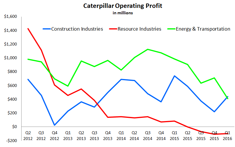 "While first-quarter results were about as we expected, sales and profit were well below the first quarter of 2015. Sales declined across the company with substantial reductions in construction, oil and gas, mining and rail. While many of the industries we serve are challenged, we remain focused on what we can control: the quality of our products, our market position, safety in our facilities and continued restructuring and cost reduction." said Caterpillar Chairman and Chief Executive Officer Doug Oberhelman, in a press release.