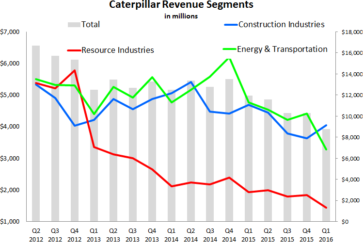 Declining sales volume, price realization, and currency woes all combined to send Caterpillar's total sales and revenues down to $9.46 billion during the first-quarter of 2016, which compares poorly to last year's $12.7 billion. Sales declined in all regions, and sales declined in all segments.