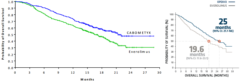 Still, we can make some comparisons between the two drugs because the companies used the same active control. The median overall survival was 4.9 months longer for patients receiving Cabometyx (21.4 months) versus those receiving Afinitor (16.5 months). By comparison, patients on Opdivo lived for a median of 25 months versus 19.6 months for patients on Afinitor, a difference of 5.4 months.