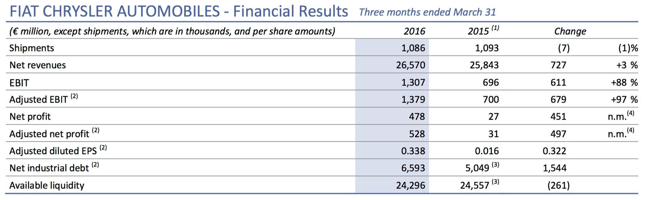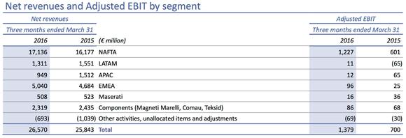 Source: Fiat Chrysler Automobiles. 2015 results have been restated to exclude Ferrari, which was spun off in October of last year. First-quarter adjustments of 72 million euros include charges for North America capacity realignment, Venezuela currency devaluation, and restructuring costs. 2015 debt and liquidity numbers are as of Dec. 31.