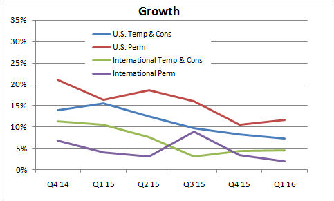 On a slightly disappointing note, growth appeared to slow during the quarter. On the earnings call, management outlined how global temporary and consulting staffing revenue growth slowed to 6.3% as it exited the March quarter (compared to a growth rate of 6.7% in the quarter). Growth in the first two weeks of April was only 5.5%.