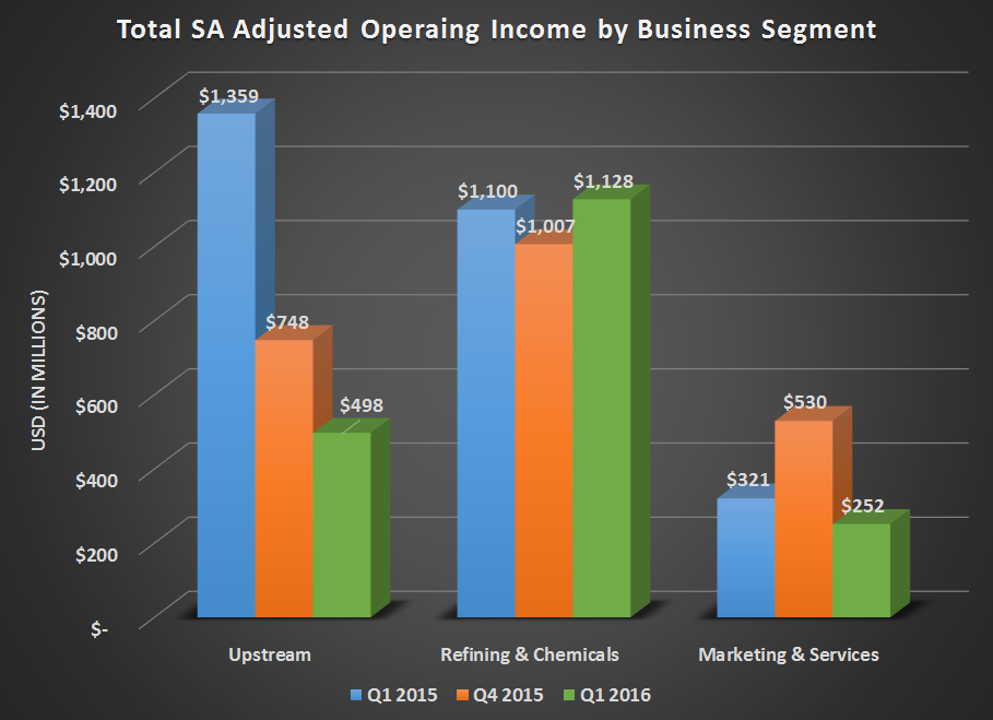 Total's refining & chemicals and marketing & services businesses have looked strong in recent quarters, but Total won't see a return to larger profits until we see a decent uptick in oil and gas prices. That the company's upstream segment has remained modestly profitable is a testament to its cost-cutting efforts; in the coming quarters, it's worth watching to see if it can eke out slightly better profits, even with these low oil prices. If it can, then when the market for oil does turn, expect Total to be in very good shape.