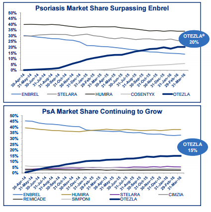 Fortunately the company continues to see an upward trend in U.S. market share, with Otezla capturing 38% of psoriasis patients switching brands or starting therapy and 42% of psoriatic arthritis (PsA) patients switching or starting therapy. But even after capturing a large percentage of new-to-brand patients, Celgene only has a fraction of the overall market for both diseases, leaving plenty of opportunity left. In the psoriasis market, Otezla passed Amgen's (AMGN 0.28%) Enbrel last year and has its sights set on catching Johnson & Johnson's (JNJ 0.07%) Stelara.