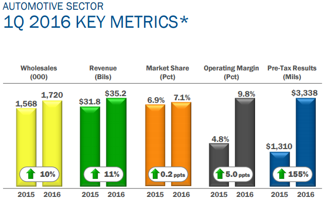 Ford's top-line revenue jumped $3.8 billion from last year's first quarter to $37.7 billion during the first three months of 2016, driven by rising wholesales, which checked in at 1.7 million units. Thanks to sales of highly profitable vehicles in the U.S. market, Ford was able to turn that expanding revenue stream into $3.8 billion in pre-tax profit – a strong $2.1 billion jump over last year's quarter.