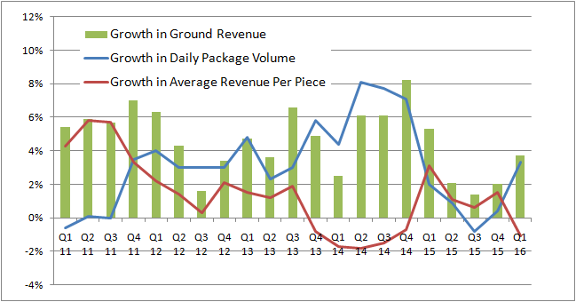 Turning to the key U.S. domestic segment, the tale of the quarter is best expressed by looking at a chart of the segment's revenue, revenue per piece, and volume growth. As you can see below revenue per piece turned negative as rate improvements were offset by lower fuel surcharges. In addition, the relative increase in B2C deliveries as opposed to B2B (business-to-business) deliveries pressured revenue per package.