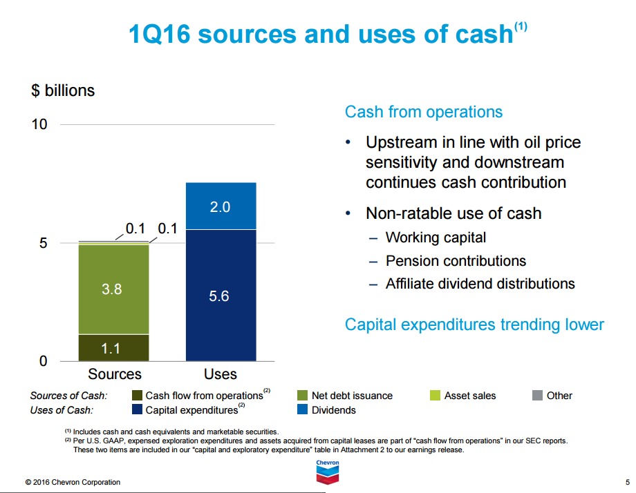 From a cash flow perspective, things don't look much better. The company has reduced capital and exploratory spending by 19% compared to last year as some major capital projects have come online, but cash flow from operations has dried up even faster. Not only did Chevron need to take out another $3.8 billion in debt, but it also had to reach into its cash pile to pay the rest of its expenses for the quarter.