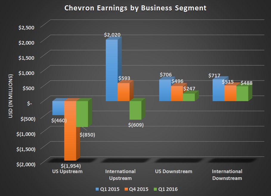 When you add the decline in refining margins to the low price issue, it's clear why the company has been struggling. Here's a quick breakdown of Chevron's earnings by business segment. A key point of note in these numbers is that U.S. upstream earnings increased significantly from the fourth quarter. That's because Chevron realized a $955 million asset impairment at the time that was absent in the recently reported quarter.