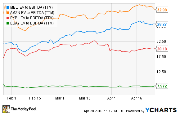 Thanks in large part to its recent run, the stock trades at a seemingly stretched EV/EBITDA of 28, representing a clear premium to PayPal at 20 and an even wider one to eBay at 8. While Mercadolibre's long-term growth trajectory is certainly exciting, the risks of doing business in turbulent Latin America need to be fully factored in as well.