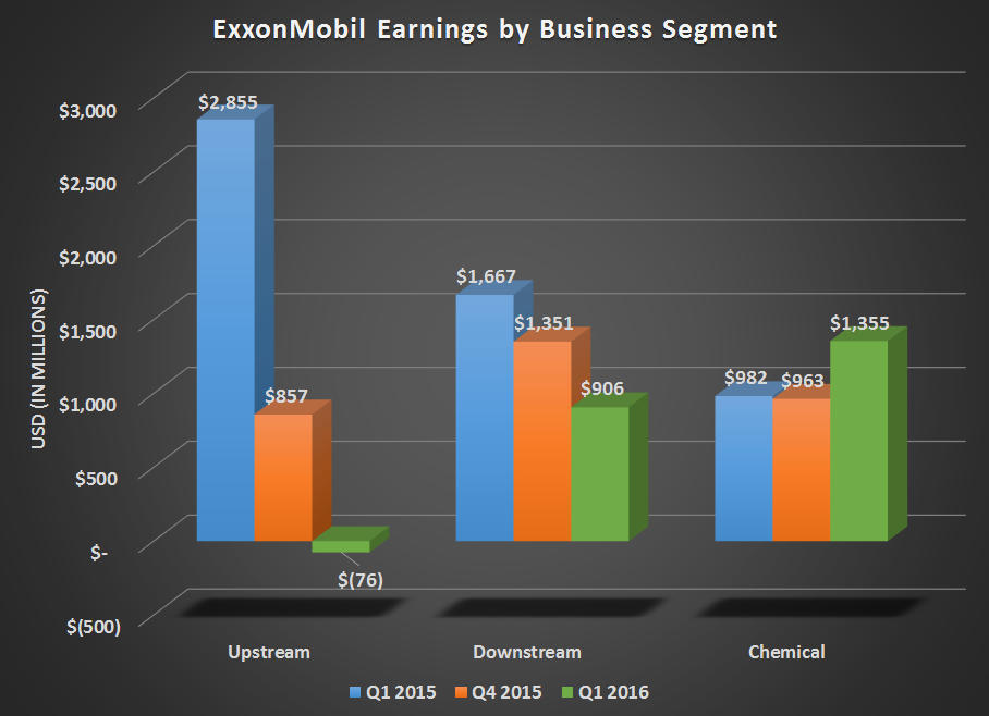 This quarter was the first quarter where ExxonMobil's upstream production unit slid into a loss, and all of that loss came from the company's U.S.-based operations. At the same time, refining margins were a bit weaker in the fist quarter, which led to a modest decline in downstream earnings. The one saving grace for ExxonMobil this quarter was its chemical division, which performed very well, and made up for weakness elsewhere. Here's a quick breakdown of those results.
