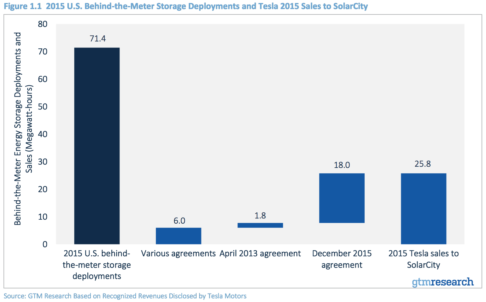 Over the past three years, SolarCity has signed a number of supply agreement with Tesla Motors for energy storage systems, both in the home and for businesses. By GTM Research's estimates, Tesla Motors supplied SolarCity with 25.8 MWh of energy storage systems in 2015, or 36% of all behind-the-meter energy storage installed in the U.S. "Behind the meter" basically just means the utility doesn't control the energy storage system, it's on the customer's side of the meter.