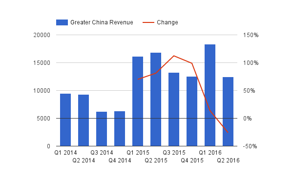 Unfortunately, the smartphone market in China is getting saturated. Moreover, comparisons were already particularly difficult for Apple last quarter, as China sales in the second quarter of fiscal 2015 had increased by a massive 81%. In addition, performance was hurt by channel inventory reductions and currency weakness during the period.