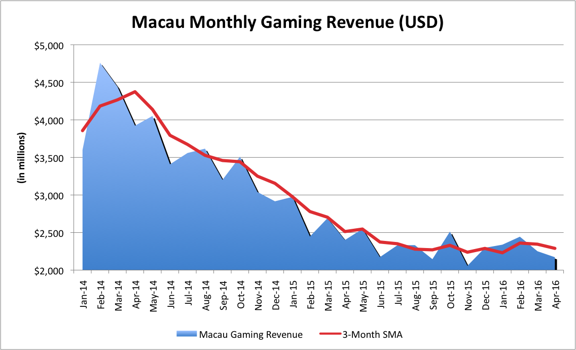 The narrative of Macau's recovery has taken a beating the last couple of months as the region's gaming revenue decline has continued. April showed a 9.5% drop in gaming revenue year over year to $2.17 billion, which isn't as big a big drop considering that in recent quarter 40%+ revenue declines were not unheard of. But it's also not proof of a bottom in the market, something Wynn Resorts (WYNN +3.12%) and Las Vegas Sands (LVS +1.98%) have both alluded to recently.