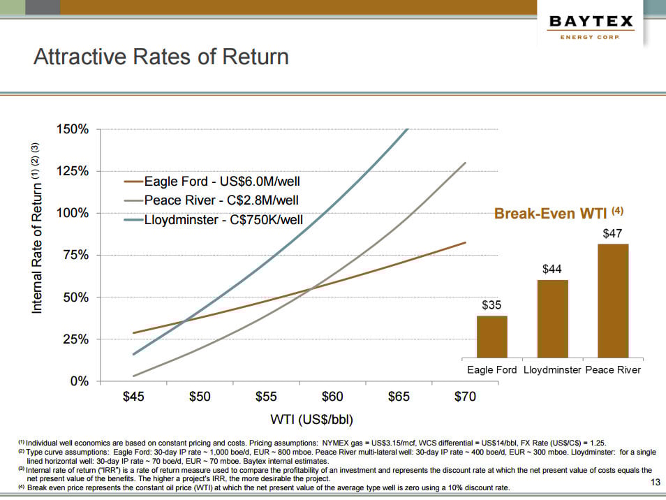 Not only is a larger percentage of Baytex Energy's production currently threatened by very weak oil prices, but the company's drilling economics are very threatened as well. In fact, based on the projected forward oil price in 2016, the company has decided not to invest any capital into its two heavy oil developments this year. As such, it will forgo drilling a dozen wells at its Peace River development and two dozen wells at Lloydminster.