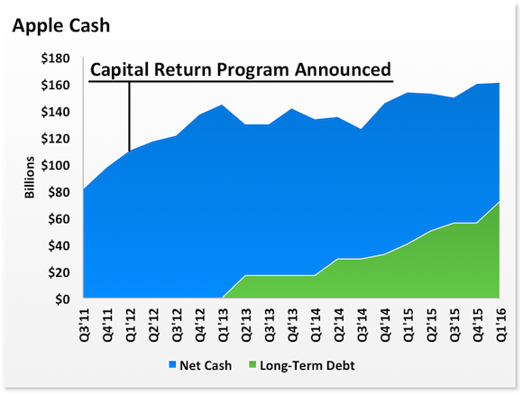 Yet here we are four years later, and Apple has given back $163 billion but still has more than it needs. At last count, Apple's net cash position was $161 billion, or 65% more than what it had when it announced the program. That includes $233 billion in gross cash and about $72 billion in long-term debt.