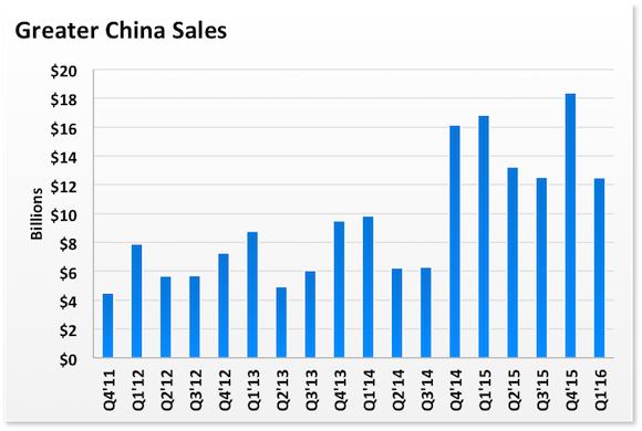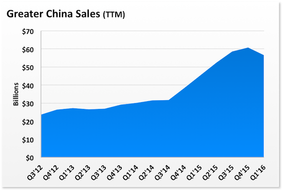 If you look at the longer-term trajectory of Apple's business, there's very little cause for concern. On a quarterly basis, sales continue to march higher and you can see just how strong of a 2015 Apple enjoyed in The Middle Kingdom.
