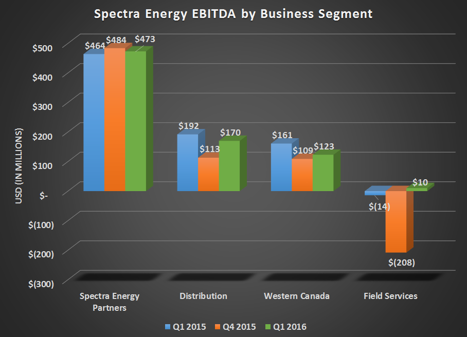 There are a couple of things that really pop out in these results. The largest is stark difference between this quarter and the prior quarter. There are a few things at work, here. Last quarter, the company took sizable goodwill impairments and other writedowns on its equity investment in DCP Midstream Partners (DPM +0.00%). Also, as part of that DCP Midstream writedown, Spectra Energy transferred ownership of the Sand Hills and Southern Hills NGL pipelines from Spectra Energy Partners (SEP +0.00%) to DCP Midstream Partners. This is part of the reason Spectra's EBITDA and distributable cash flow were lower than the same quarter last year. Here's a breakdown of the company's EBITDA by business segment.