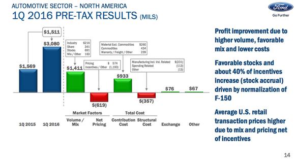 Here's the summary: Ford had more F-150s, Edges, and MKXs to sell in the first quarter than it did last year. Those are all very profitable, in-demand products. Having more meant that Ford was able to improve its "mix" of products sold and get year-over-year improvements in pricing. It also meant that it had to take a larger allowance for the usual incentives on those sales, particularly on the pickups -- but that was more than offset by the good gains on sales volumes and mix.