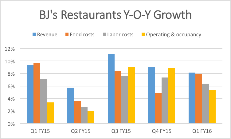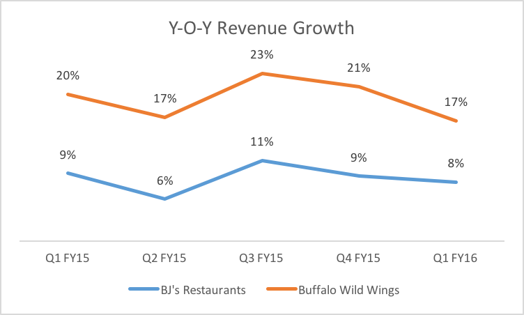 Growth wasn't too shabby at BJ's as its revenue increased 8% year-over-year. Although the pace was slower than at its counterpart, BJ's was able to convert more of its sales growth into bottom line profits. In the first quarter, BJ's grew operating income 25%. This performance marked the seventh consecutive quarter during which the company was able to grow operating income faster than revenue. Meanwhile, Buffalo Wild Wings grew operating income just 7%.