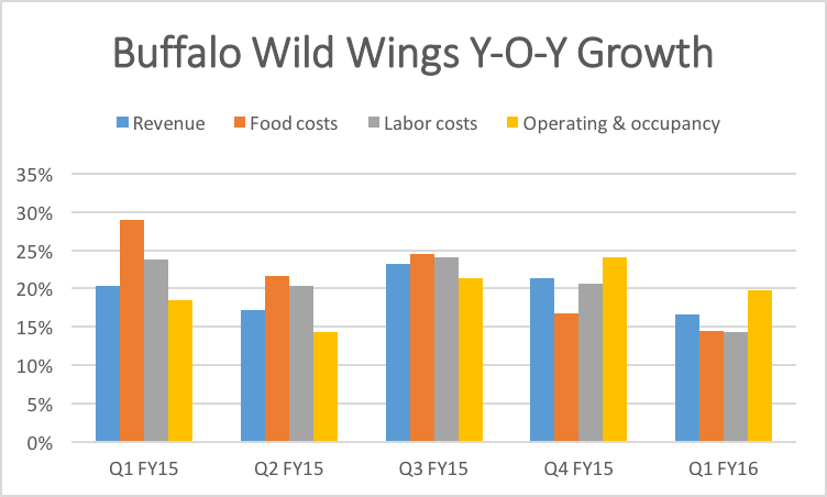 Buffalo Wild Wings, on the other hand, has struggled to maintain the same level of efficiency. Over the past five quarters, food, labor, and occupancy costs have consistently outpaced sales growth.