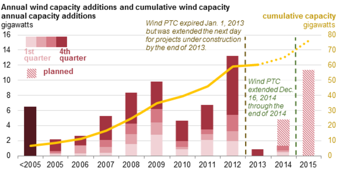 For investors, this introduces real risk. Wind's recent rise is due to plenty of factors, but regulation has played a real role in making this energy source competitive. In fact, part of the reason wind has expanded so rapidly is due to installers attempting to get construction going before tax credits expired (although they ultimately keep on getting extended). A quick glance at this chart of wind installations illustrates just how much regulation has changed wind's direction: