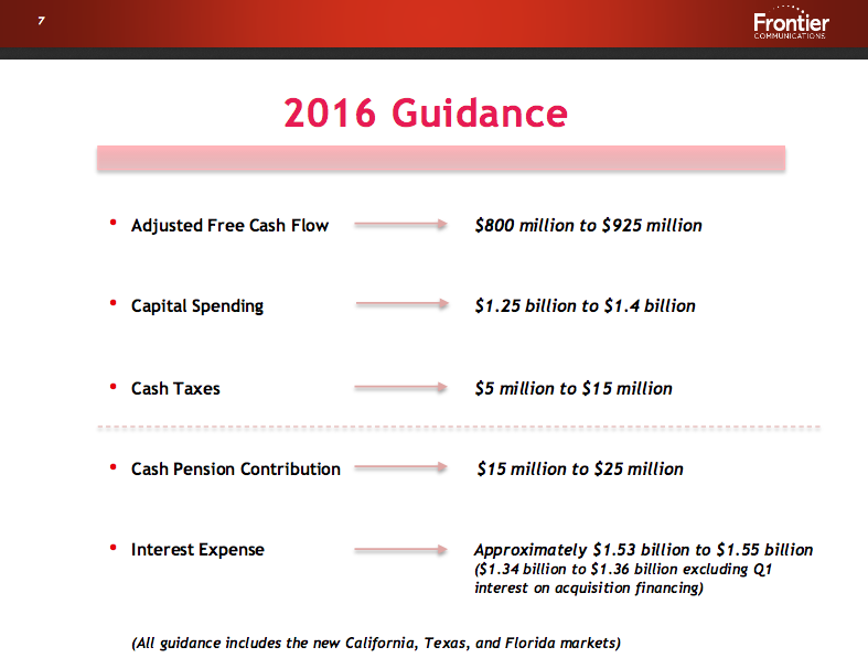 Frontier (FTR +0.00%) had a respectable first quarter of 2016, gaining some broadband customers while dropping a few video subscribers. It lost $186 million on $1.35 billion in sales, but that was due to interest expenses and costs related to its $10.54 billion purchase of Verizon's wireline business in California, Texas, and Florida.