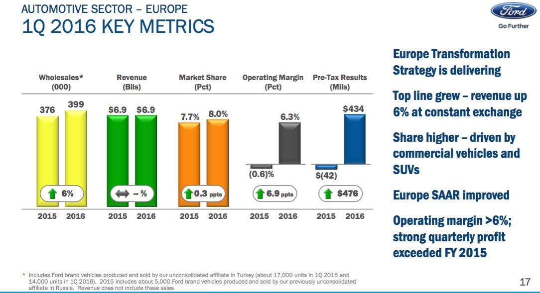 Shanks also noted that Ford's team in Europe was able to bring down costs year over year. "And even though it's not shown on the slide, even though the Russian market continues to be very challenging, [Ford's business in] Russia improved on a year-over-year basis as well."