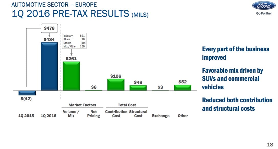 But somewhat more surprisingly, so did Europe. Ford lost billions in Europe between 2011 and 2014 before rebounding to a modest $259 million profit last year. But it has already beaten that 2015 result in 2016: Ford's European unit made $434 million in the first quarter, a huge improvement over the $42 million loss it posted in the first quarter of 2015.