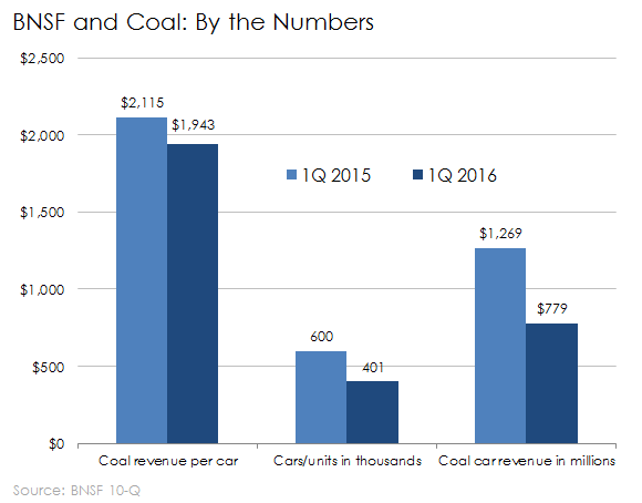 BNSF's first-quarter filings blame the decline in coal volume on higher customer inventories, low gas prices (natural gas is an alternative fuel source for coal power plants), and a decline in electricity generation due to a mild winter. Though the one-third decline in coal volume this quarter may be much more severe than one would expect over the next decade, it does show just how important coal is to railroad profits.