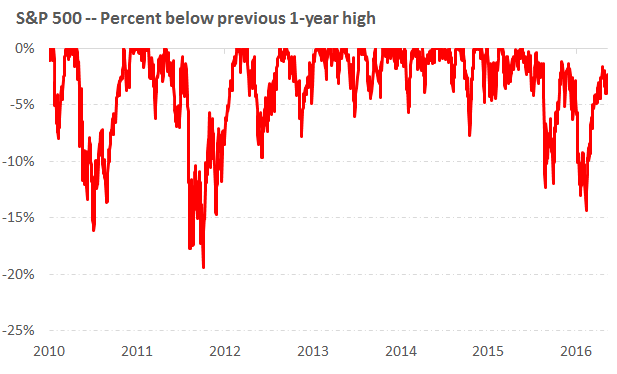 But the last seven years have actually been pretty nuts. The market has been below its previous one-year high on 87% of days since 2010, and more than 10% below its previous high on about 11% of all days: