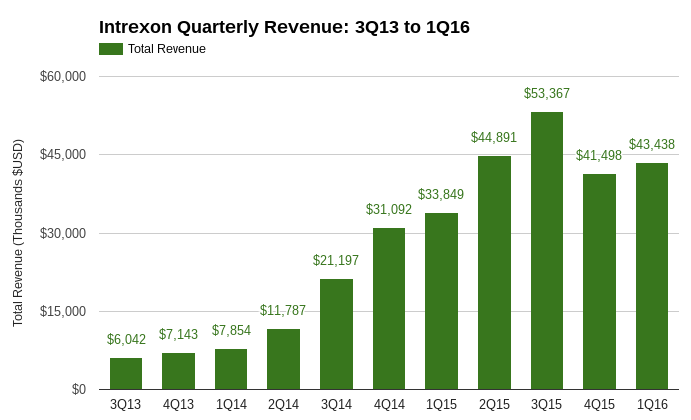 Total revenue for the quarter settled at $43.4 million, which marked a 28% increase from the year-ago period. The growth was mostly driven by collaboration and licensing, with product revenue and services revenue -- essentially all derived from the Trans Ova cattle breeding and genetics platform -- remaining flat. Unfortunately, that means investors who were hoping that Intrexon's hockey stick quarterly revenue chart could get back on track after a dip to close out 2015 will be a little disappointed.