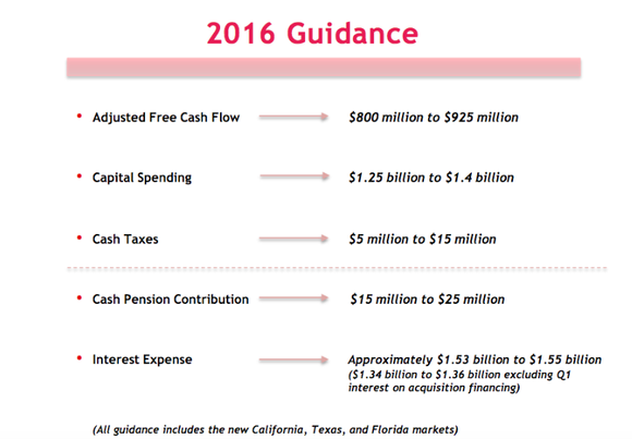 In light of the completion of the purchase, Frontier offered a new forecast for 2016. The company expects adjusted free cash flow in the range of $800 million to $925 million, which is impressive when you consider that interest charges relating (mostly) to the Verizon deal are forecast at $1.53 billion to $1.55 billion.