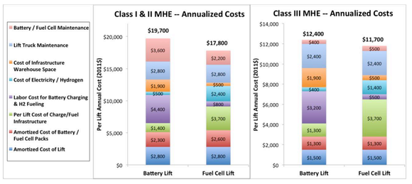 According to a report from the National Renewable Energy Laboratory, the value proposition is clear. Most notably, whereas labor costs for battery charging/hydrogen fueling, battery/fuel cell maintenance, and the cost of infrastructure warehouse space amount to $9,900 for battery equipment, the cost for fuel-cell equipment is only $3,500.