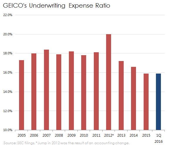GEICO may be finding its sweet spot. Underwriting expenses have been trending lower in recent years.