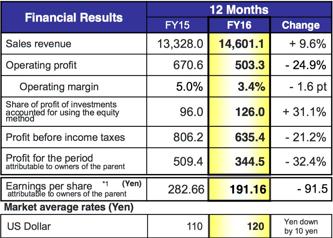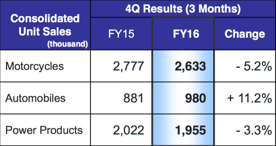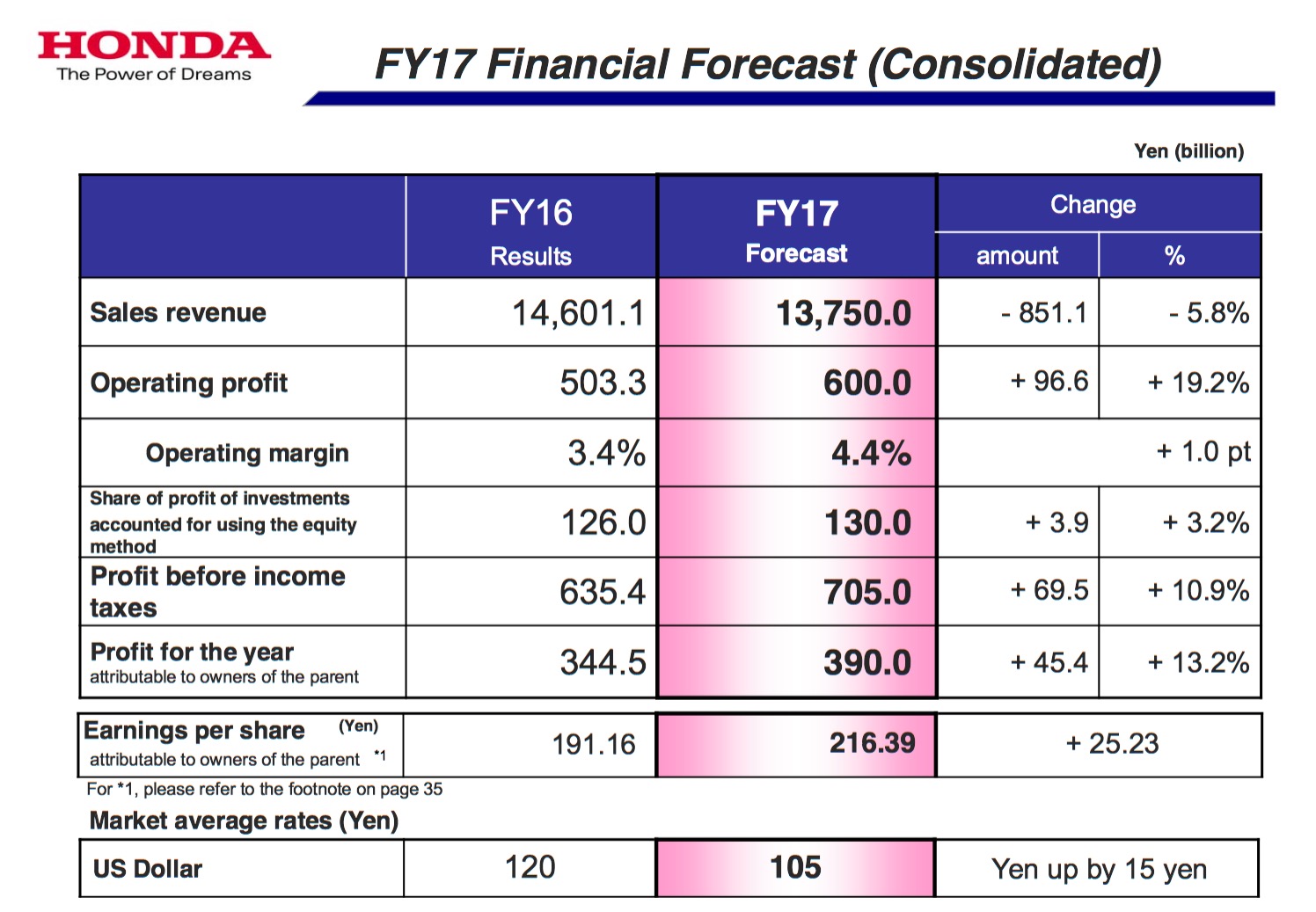 Honda is forecasting modest increases in sales across all three of its business segments. While it expects revenue to decline 5.8% to 13.75 trillion yen, in part because of unfavorable exchange-rate shifts, it expects operating profit, operating margin, and net profit for the full year to come in significantly above fiscal year 2016 levels.