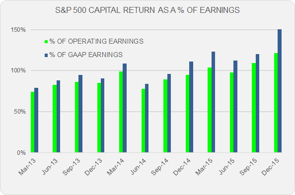 In fact, capital return exceeded earnings last year (note that the bars for the last four quarters extend above 100%). Clearly, that's not a sustainable policy, and it's one reason I think this bull market -- now the second longest in history -- could be exhausting itself.