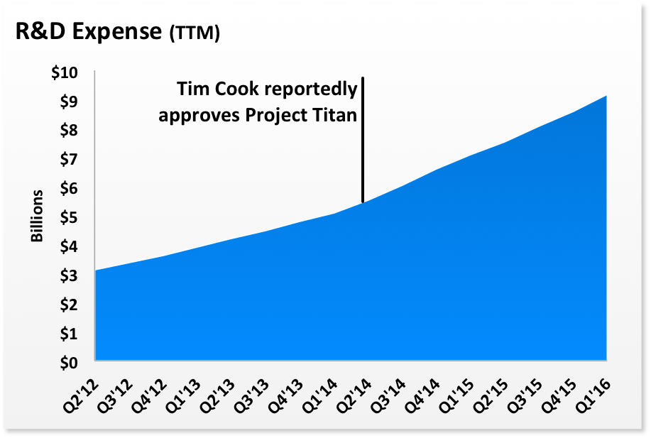 But look how Apple's R&D expenditures have soared in recent years in absolute dollar terms, too. This next chart is particularly effective if you consider when CEO Tim Cook reportedly approved Project Titan (per the initial Wall Street Journal report in February 2015):