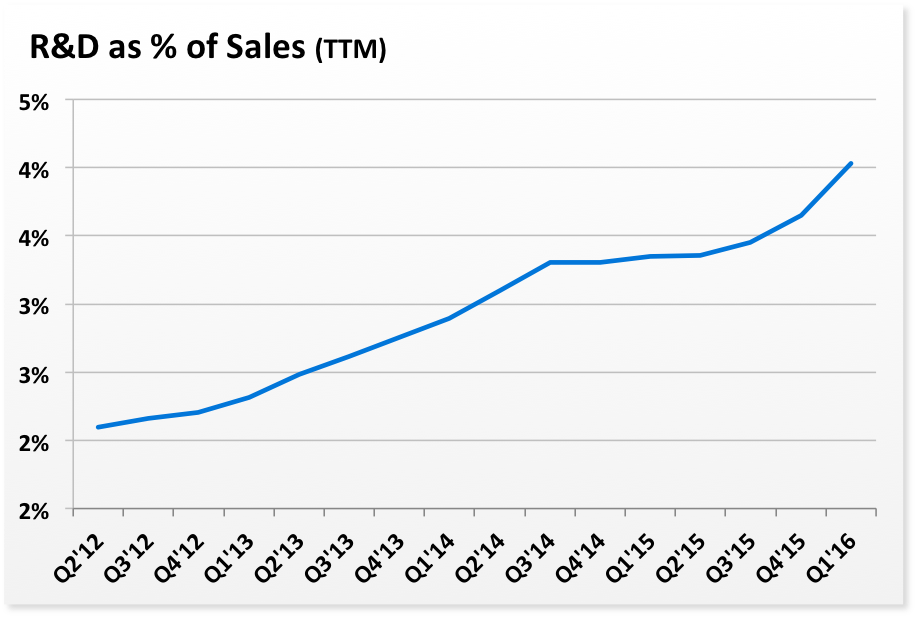 These days, R&D comprises a whopping 4% of trailing-12-month sales.