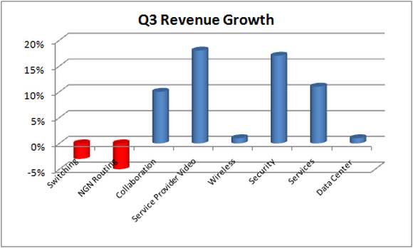 Starting with services revenue (up 11%), any way you look at it, Cisco had a good quarter. The headline number is somewhat flattering -- Cisco had an extra week in the quarter -- but as CFO Kelly Kramer explained, when service revenue growth is normalized, growth was still up 4% compared to 3% in the second quarter and 1% in the first -- a nice trend.