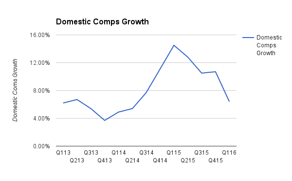 Let's get the ugly out of the way. Although those first quarter comps of 6.4% represented an 810 basis point drop from last year, comps have been on the way down since the first quarter of 2015. They're more in line with performance seen just before the surge but are actually double the 20-year comps average. The meteoric growth that ended last year was the anomaly.