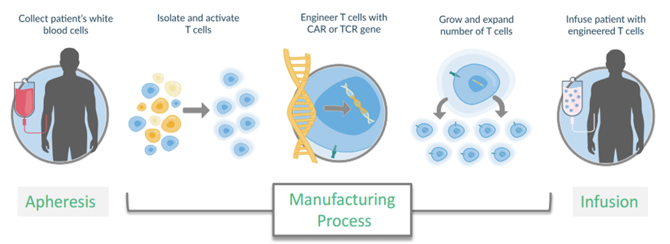 Although the biopharma industry is currently pursuing multiple lines of research, the next big step forward for cancer immunotherapy is widely expected to come from the area known as chimeric antigen receptor (CAR) transduced T cells. CAR Ts are made by extracting a patient's T cells from his or her blood and then using a viral vector to get the cells to express a receptor associated with a specific cancer antigen. These modified cells are then infused back into the patient, where they are then able to recognize and eliminate the cancerous cells of interest.