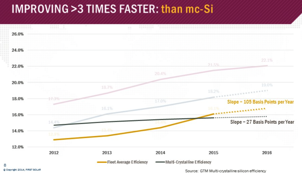 But in 2014 the company started to rapidly improve panel efficiency and today it has a more efficient product than many competitors.