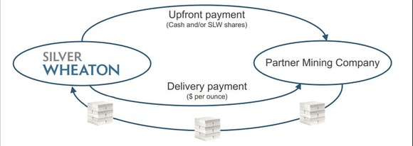 That's where a company like Silver Wheaton comes into play. Silver Wheaton is what's known as a streaming company. It provides upfront payments to miners like Hecla for the right to buy silver and gold at reduced prices in the future. It's kind of like a specialty finance company that gets paid in silver and gold.